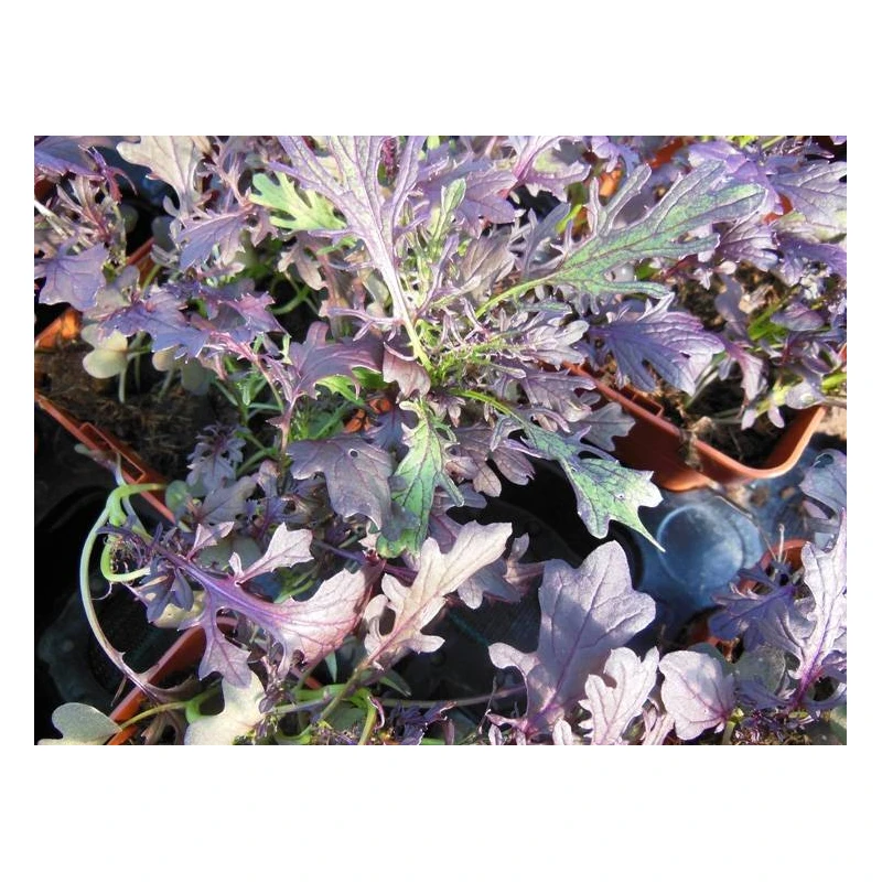 La moutarde de Chine Purple frills est proche de la variété Hakarachi par la forme de ses feuilles au bord frisé, mais avec une couleur pourpre. C'est une moutarde commune bisannuelle originaire de la façade humide du nord de la Chine, de Corée et du Japon. On la cultive depuis fort longtemps en Chine et c'est autour de 1920 qu'elle commence à être répertoriée en Europe pour la production de graines. Ce légume ancien qui entre dans la composition de nombreux plats de la cuisine Chinoise, peut faire des feuilles de 60 cm de haut. C'est une plante que je vous conseille de planter dans votre potager pour au moins l'essayer en salade. Vous ne serez pas déçu.