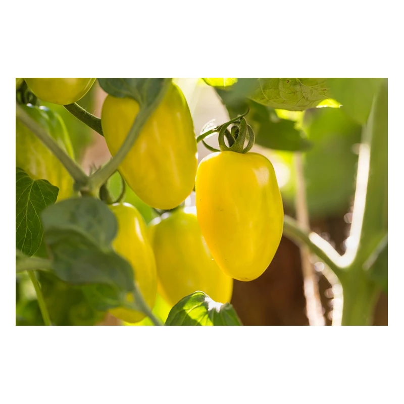 La tomate "Citrina" est un fruit en forme de citron de couleur jaune clair destiné aux salades et sauces tomates originales, aux pizzas, tartes salées tomates, ail et thym et confitures de tomates mûres.